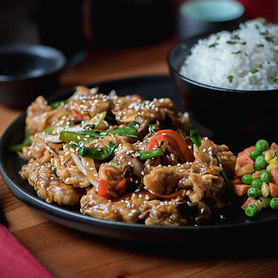 روبيان مقرمش بنكهة الصوص الحلو الخاص بالشيف مع لمسة خفيفة من النكهة الحار مع رشة من بذور السمسم